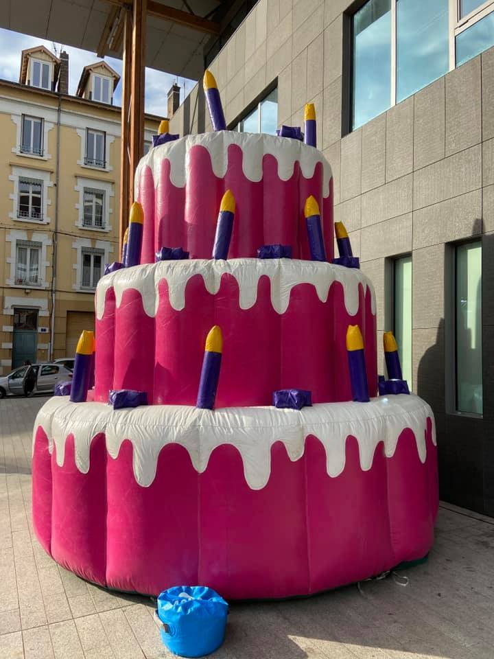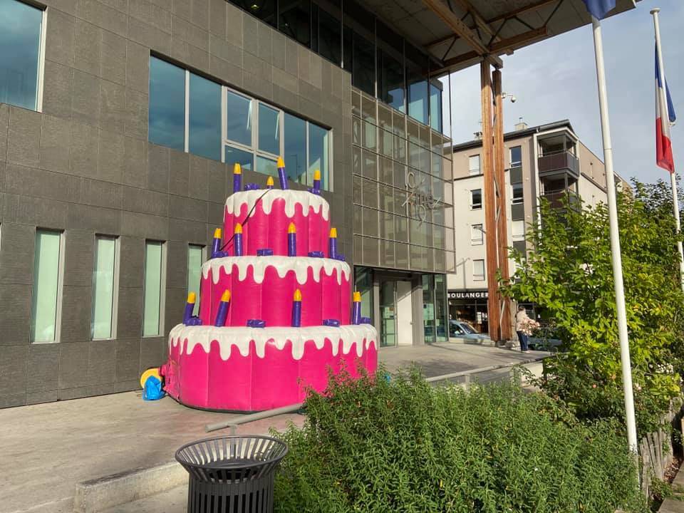 Joyeux anniversaire la médiathèque d’Oullins ! Installation de notre gâteau gonflable géant pour accrocher le regard