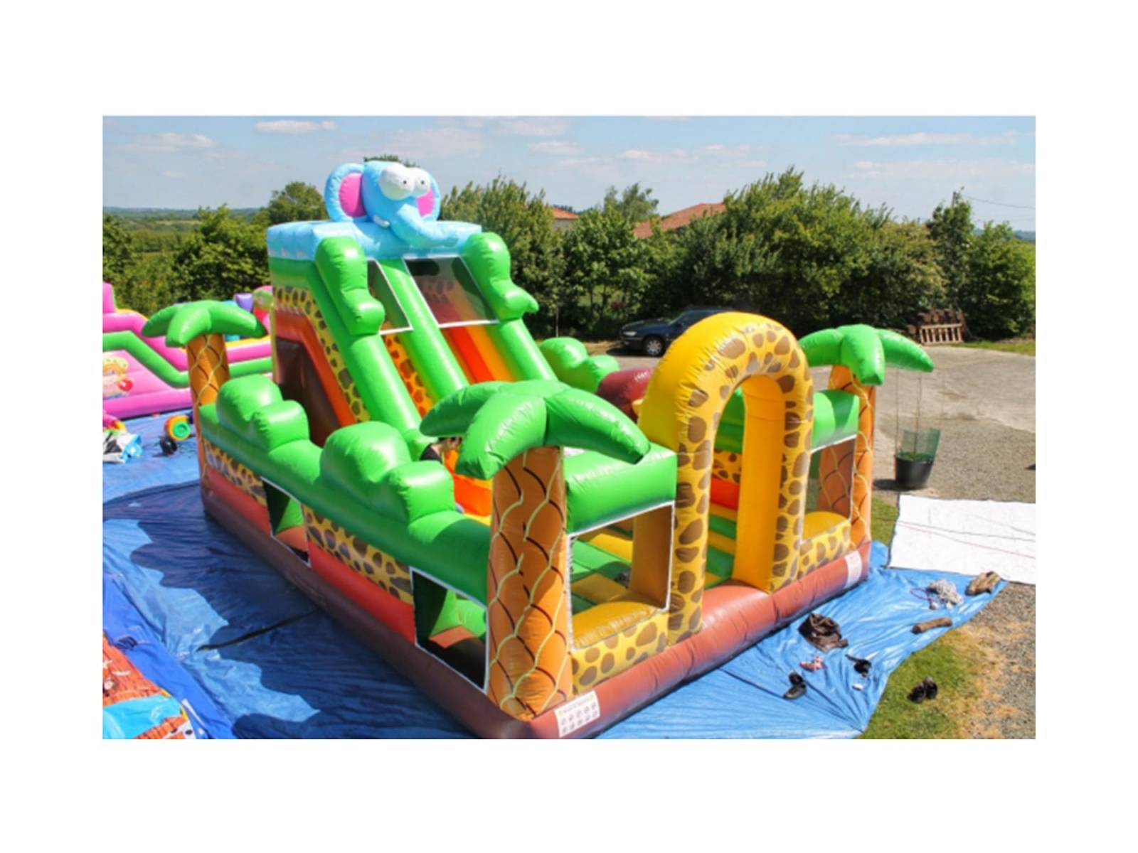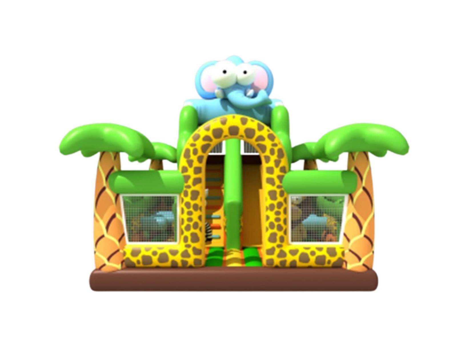 Ce multiplay éléphant qui propose un toboggan, des zones pour sauter et des obstacles comme le zèbre ou le lion est un incontournable des jeux gonflables.