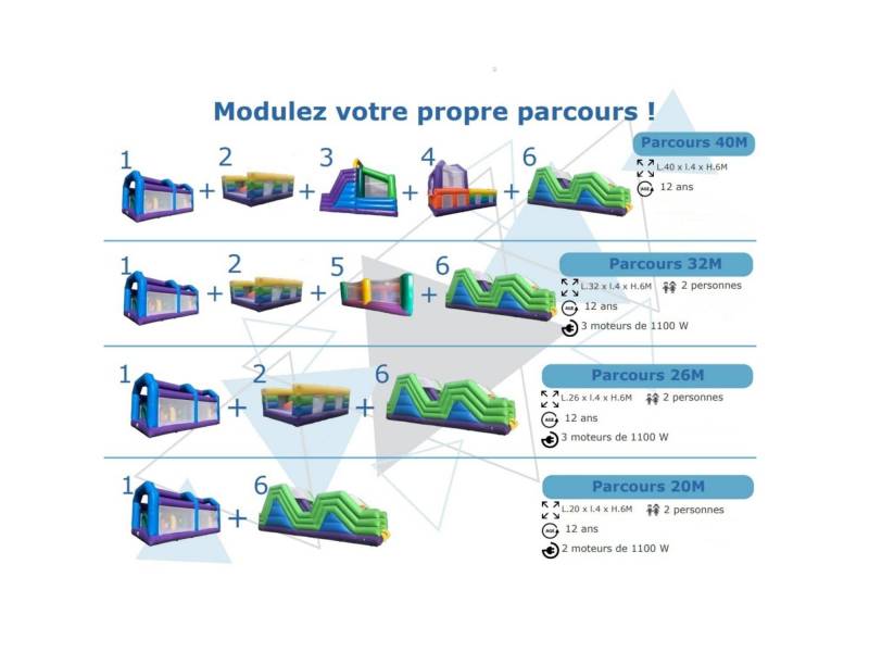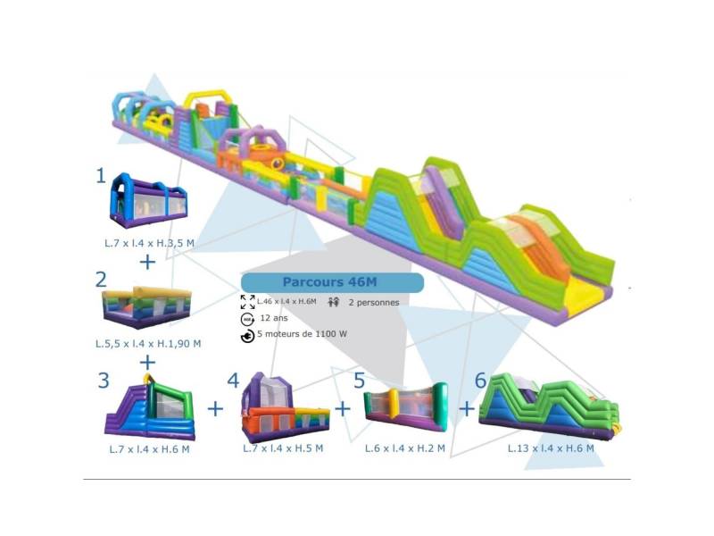 Le parcours Mega Jump est un parcours qui peut se moduler de multiples façons. En réunissant toutes les pièces, il atteint 46 mètres d'amusement pour les enfants. Si c'est trop long, vous pouvez très bien louer une seule partie ou en combiner deux ensembles. Tout est possible avec cette structure gonflable !