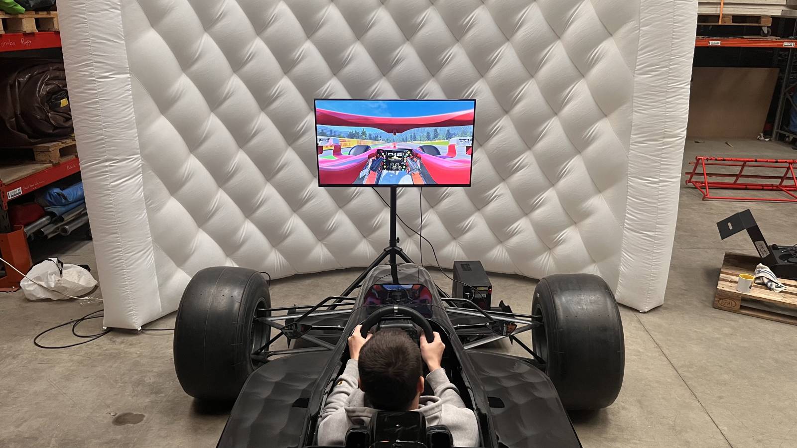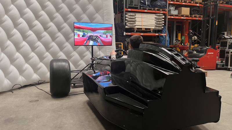 simulateur course automobile, jeu de course interactif, volant retour de force, simulateur voiture statique, animation simulateur pilotage, événement d'entreprise, simulateur F1, expérience immersive, location simulateur auto, KV Events.