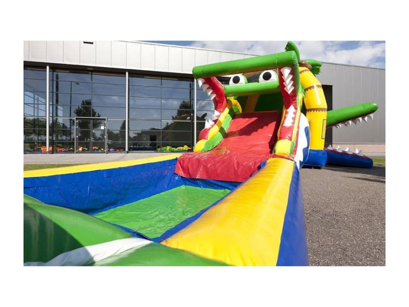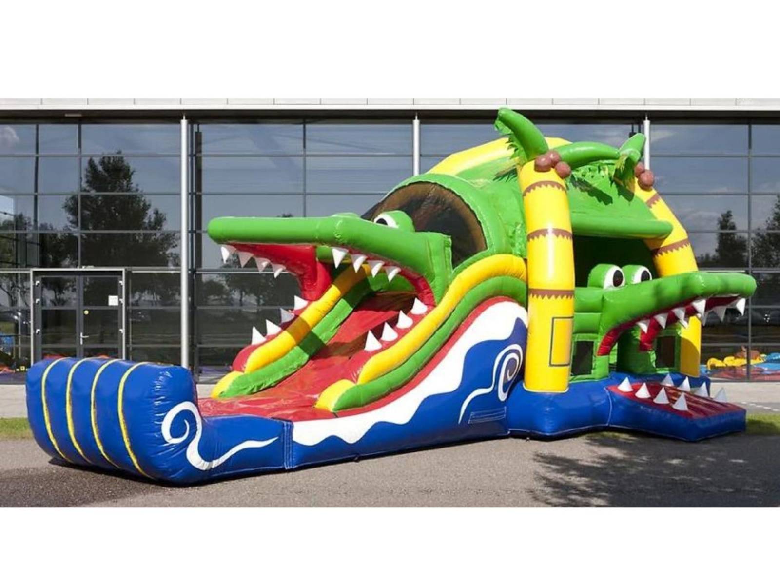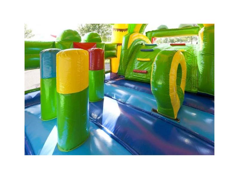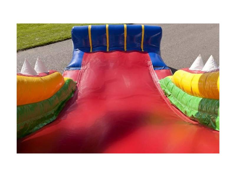Un toboggan, des obstacles, une partie escalade et deux bouches de crocodiles avec leurs dents pointues : voici l’essentiel de cette structure gonflable. Dans son thème de la savane et des régions chaudes, on y retrouve des palmiers et des vagues pour sublimer son design.